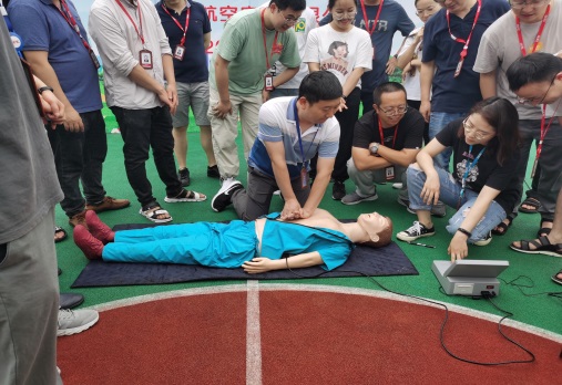 随后进行心肺复苏急救实操,包括判断意识、向周围人求救、进行胸部按压等内容。操作过程中,员工根据智能评分系统及工作人员提示,不断调整按压位置及操作姿势、控制按压频率与力度,在实操中掌握急救技能。