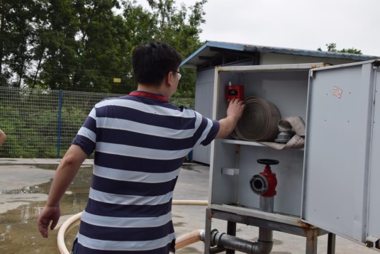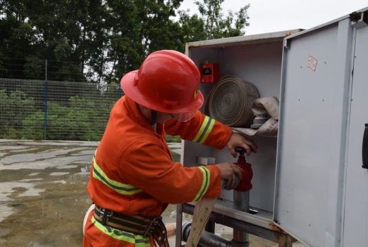 首先是报警及灭火。火灾发生时,一人立即报警,报警时需说出部门(单位)、报警人的姓名、起火地点及火灾类别。同时,另外一人穿上防护服并展开消防水带、安装好消防水枪。报警人报完警后迅速穿上防护服并打开消火栓箱门,水带一头接在消火栓接口上,按下箱内控制按钮,启动消防水泵,打开消火栓上的水阀开关,两人共同完成灭火。